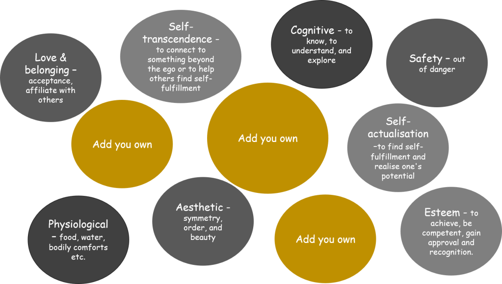 This non-ordered set of need bubbles offers you space to reflect on, re-order and customise the needs to your specific career context. Take some time and reflect on your source of career security, which basic needs are you striving to satisfy?